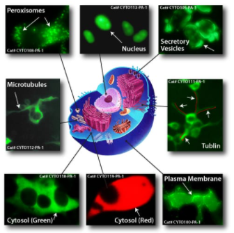 SBI’s Cyto-Tracers fuse a specific protein tag to copGFP or RFP, directing the fluorescent protein to the desired subcellular location.